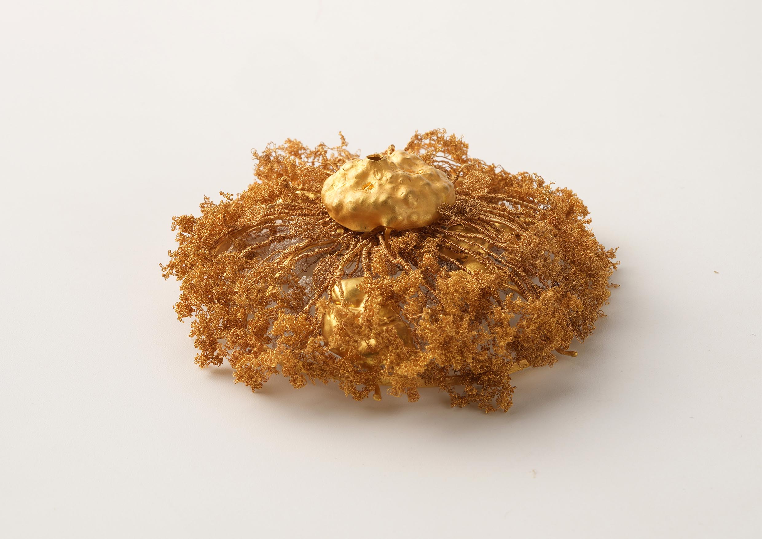 The inspiration for this piece came from my closest friend’s battle with breast cancer. During that dark time, I imagined that perhaps on some late night, when she curled up in fear, she suddenly stood up and fought back against her unjust fate—and in that moment, she became the brave person she is today. Her resilience inspired me: even a brief life should bloom as brilliantly as summer flowers. This led me to create "Live like a summer flower - Golden Mammary01" using 220 meters of 0.08mm 22K gold wire and a lock of my friend’s hair.